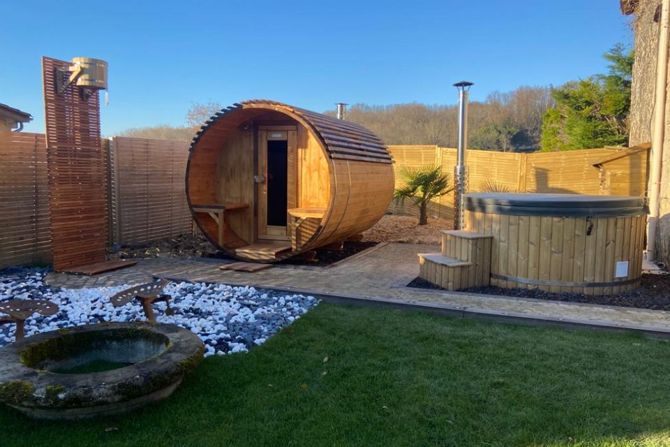 Bain nordique et sauna tonneau traditionnel chauffé au bois ;