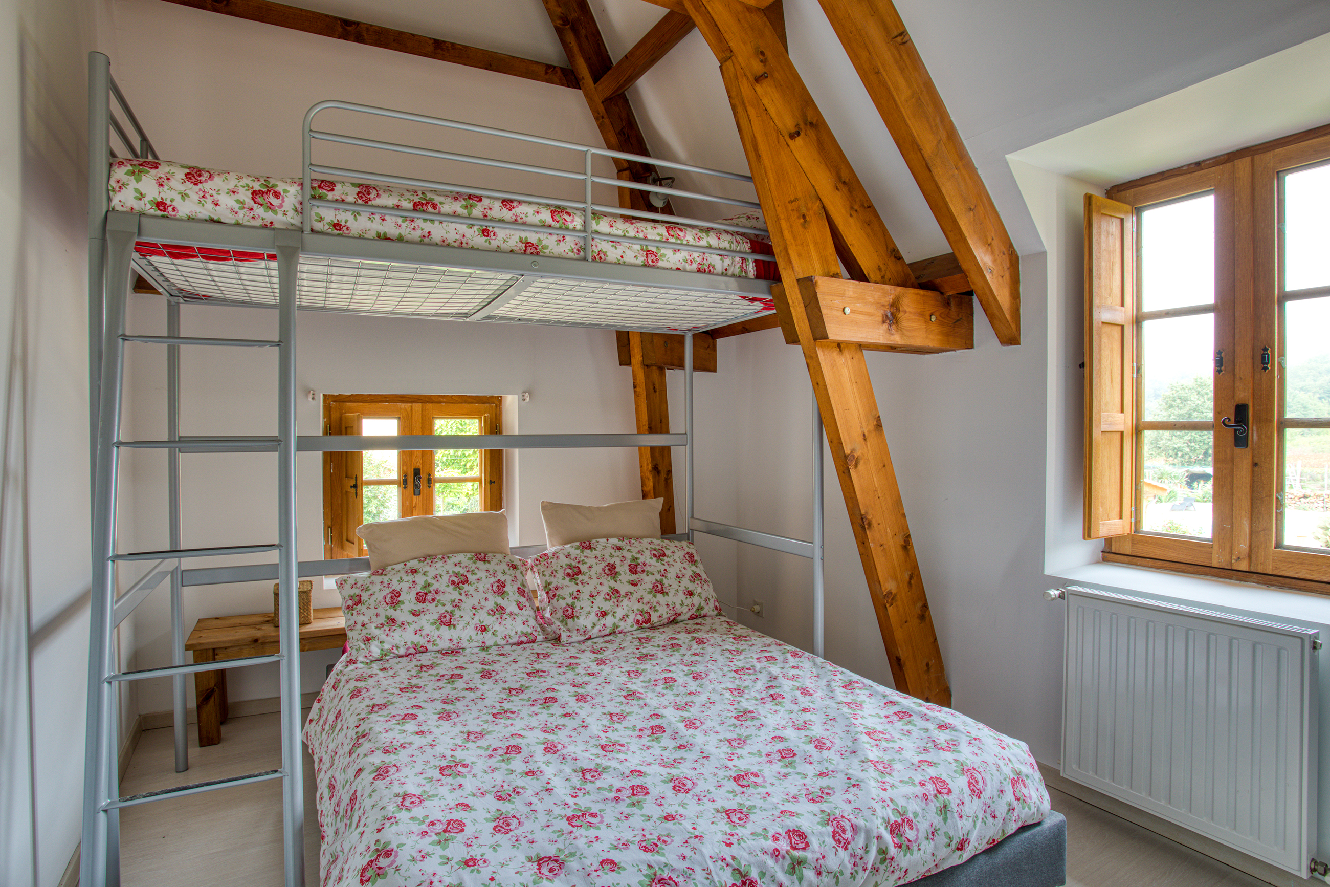1 chambre mezzanine comprenant 1 lit double (140 cm) et 1 lit d’une personne superposé