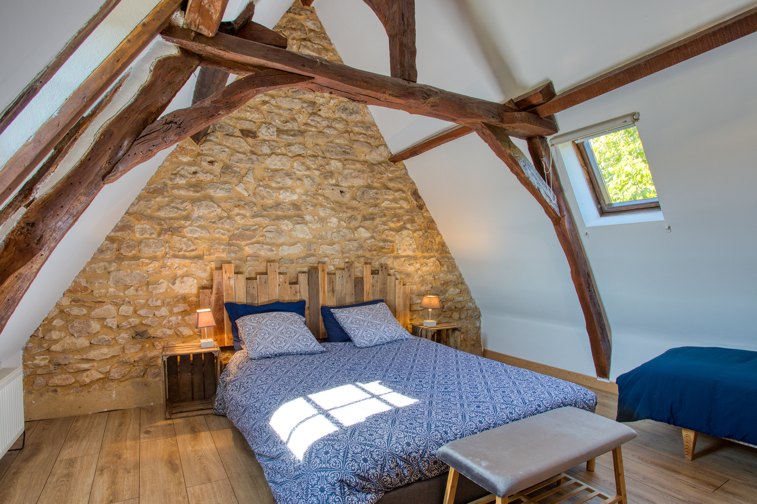 1 chambre avec 1 lit double (160 cm) et 1 lit d’une personne