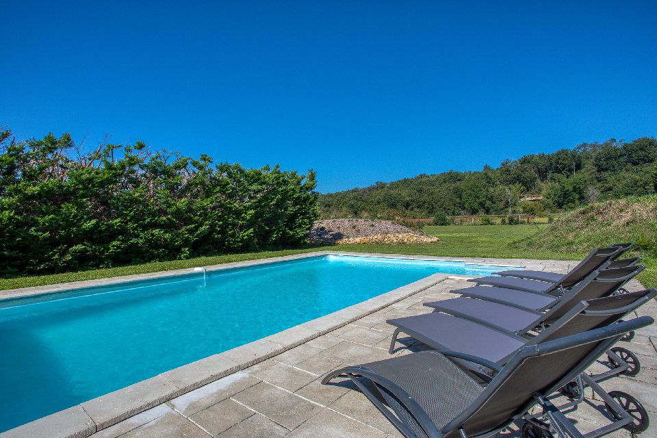 Piscine privée chauffée de mai à fin septembre. Elle comprend un système d’alarme dans le fond, très sécurisant pour les jeunes enfants ;